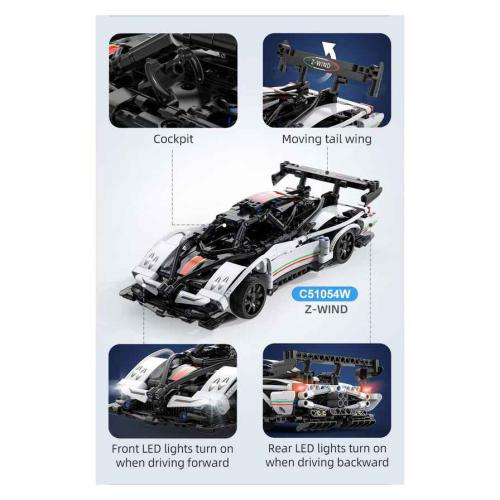O conjunto CaDA Carro Z Wind tem 457 peças e permite montar um carro de corrida com controlo remoto. O modelo tem carroçaria prateada com detalhes pretos, quatro rodas de borracha e é adequado para brincar em várias superfícies. Pode ser controlado com o comando 2,4 GHz incluído ou via app Bluetooth, com alcance superior a 25 metros e velocidade máxima de 5,5 km/h. A app oferece quatro modos: controlo remoto, programação Scratch, giroscópio e desenho de percurso.