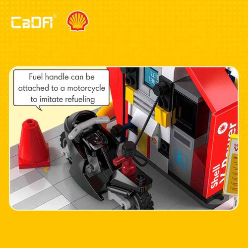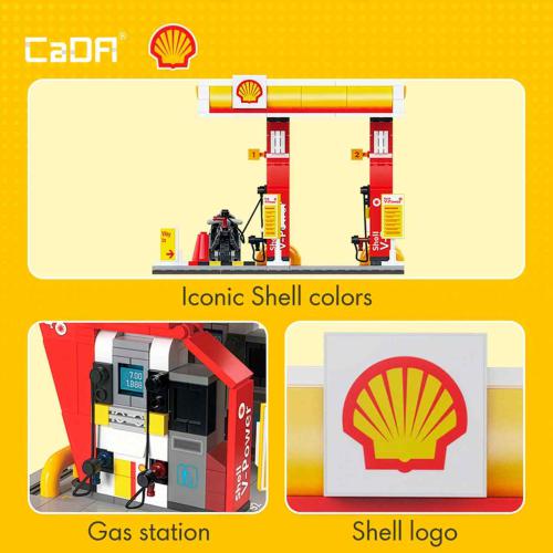 O CaDA Posto de Combustível Shell é um modelo detalhado de 305 peças que reproduz uma estação de serviço Shell com bombas de combustível funcionais, elementos móveis e acessórios realistas, ideal para colecionadores, dioramas ou como complemento ao modelo Shell Select (C66027W).