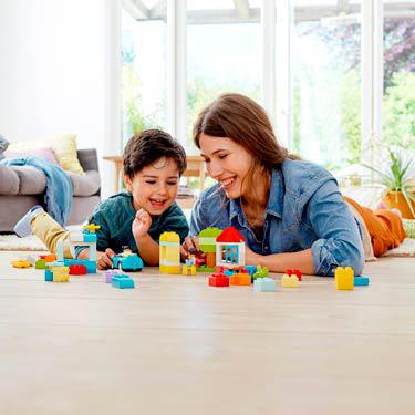 Este LEGO® DUPLO® é um conjunto de iniciação cheio de peças coloridas que incentivam a criatividade e a brincadeira imaginativa. Inclui um automóvel com rodas móveis, tijolos com números, figuras DUPLO, flores, comida e vários elementos familiares para construíres livremente. Ao combinar as peças, desenvolves a motricidade fina, o pensamento criativo e a resolução de problemas. A caixa de arrumação prática permite guardar tudo facilmente e levar o brinquedo para qualquer lado. É ideal para começares a construir e aprender através da brincadeira.