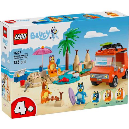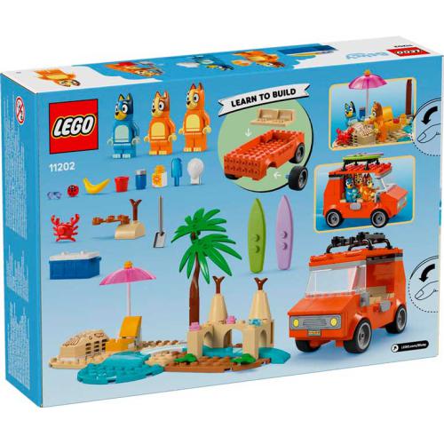 A Viagem à Praia no Carro da Família da Bluey é um set para crianças com mais de 4 anos inspirado na série Bluey, com o carro icónico, minifiguras da Bluey, Bingo e Chilli e acessórios para um dia de praia. Inclui pranchas de surf, castelo de areia, cadeira, guarda-sol, palmeira e pequenos elementos como caranguejo e gelado para brincadeiras imaginativas. O carro tem teto de abrir e espaço interior acessível. Com Peça Inicial e instruções simples, facilita a construção rápida e a diversão partilhada entre adultos e crianças.