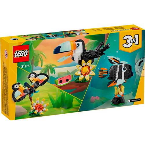 Desfruta da diversão tropical com o incrível LEGO Creator 3 em 1 Animais Selvagens: Tucano Tropical, onde constróis um tucano colorido num ramo com flores e uma fatia de melancia, com partes móveis no bico, asas e cauda para brincadeiras dinâmicas. Podes reconstruir as mesmas peças em 3 animais diferentes: tucano, borboleta ou peixe tropical, cada um com movimentos próprios e cenários naturais para expor. É um set criativo que incentiva histórias imaginativas e a exploração de animais tropicais de forma divertida.