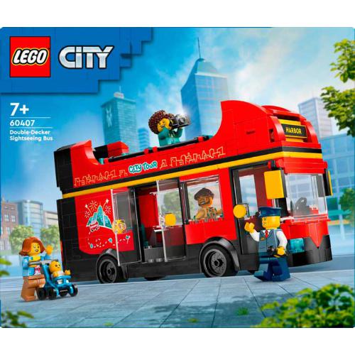 O set LEGO® City Autocarro Turístico Vermelho de 2 Pisos inclui um autocarro com piso superior aberto, ecrã de destino ajustável e espaço para passageiros. Traz 5 minifiguras, incluindo um bebé com carrinho, permitindo recriar passeios turísticos e cenas urbanas.