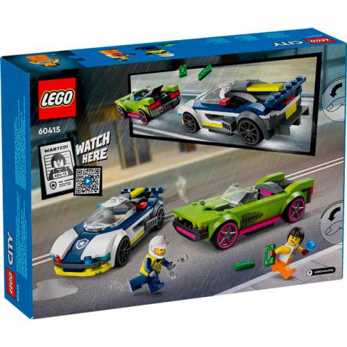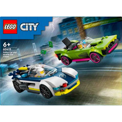 O set LEGO® City Perseguição de Carro da Polícia e Muscle Car inclui um carro da polícia e um veículo de fuga, além de minifiguras de um agente e de uma bandida. Permite recriar perseguições rápidas e histórias de ação com veículos realistas e construção guiada passo a passo.