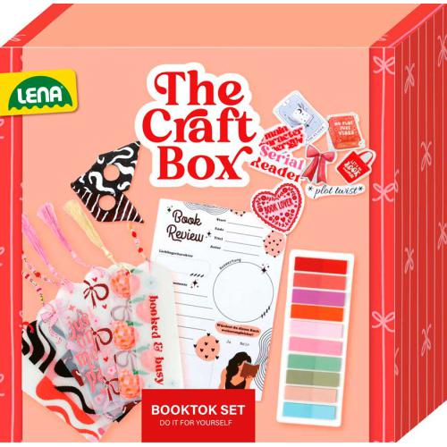 LENA® Kit de Amantes do BookTok. Criação de um marcador de livros, personalização de marcadores e colagem de marcas de anotação. O conjunto inclui argila de secagem ao ar, marcadores de acrílico, missangas e marcas de anotação. Com instruções detalhadas e coloridas. Adequado a partir dos 16 anos. Embalado numa caixa de cartão colorida e banda com informações do produto.