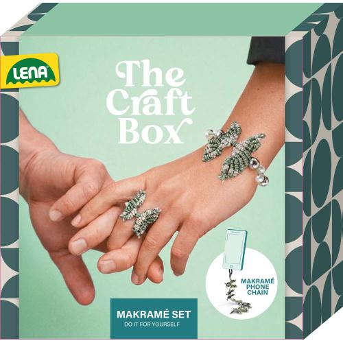 LENA® Corrente para Telefone em Macramé e Joias. Criação de um conjunto de macramé Borboleta, composto por anel, pulseira e corrente para telemóvel. O conjunto inclui fio de macramé, missangas, mosquetões e adaptador para capa de telemóvel. Com instruções detalhadas e a cores. Adequado a partir dos 16 anos. Embalado numa caixa de cartão colorida e uma banda com informações sobre o produto.