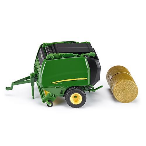 A premiada enfardadeira John Deere 990 é fabricada pela SIKU como um modelo de alta qualidade à escala 1:32 com detalhes originais. O chassis de eixo único tem pneus e jantes com detalhes originais. Com abas laterais de abertura na unidade e portão traseiro, com uma visão livre de um interior totalmente detalhado. O pé de recolha e o pé de apoio são móveis e realçam o aspeto excecional deste modelo, juntamente com o trabalho de laca e as letras de alta qualidade. Um fardo redondo é fornecido como acessório.