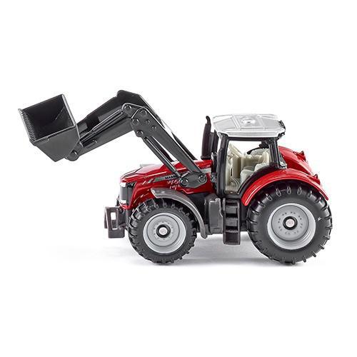 O mais recente trator Massey-Ferguson com carregador frontal no tamanho pequeno SIKU. O modelo tem um carregador frontal móvel com uma pá. A cabine amovível e o acoplamento do reboque completam a imagem deste pequeno polivalente.