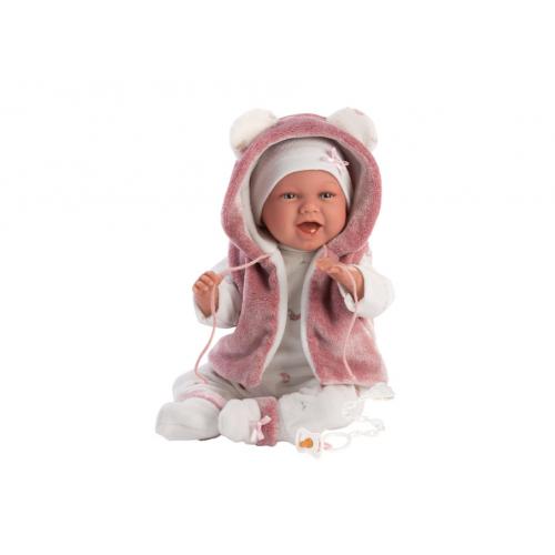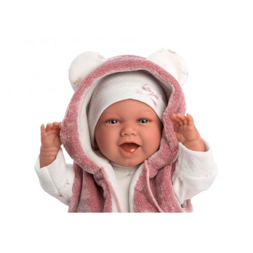 Ri como um bebé verdadeiro e chama a mamã e o papá.Inclui chupeta e porta bebés. O corpo é mole, de tecido. Os braços e pernas são articulados, em vinil muito macio. Roupa 100% algodão, lavar com água fria. Pilha: RL - 44. Vem com caixa. Feito à mão em Espanha.