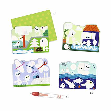Aconselhado para bebés com mais de 18 meses. Conteúdo: 4 folhas ilustradas em plástico flexível com uma zona branca que desaparece, um lápis com reservatório de água e 1 suporte em cartão espesso.