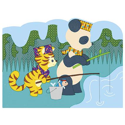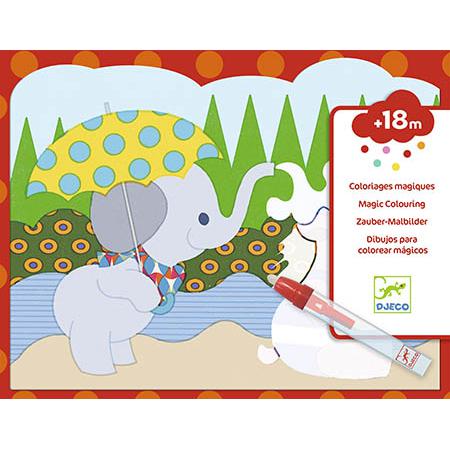 Aconselhado para crianças com mais de 18 meses. Conteúdo: 4 folhas ilustradas em plástico flexível com uma zona branca que desaparece, um lápis com reservatório de água e 1 suporte em cartão espesso.