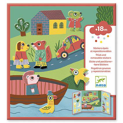Aconselhado para crianças com mais de 18 meses. Conteúdo: 1 tríptico com um cenário para completar (43 × 23 cm) e 13 autocolantes em vinil reposicionáveis. Embalagem em cartão com certificação FSC®.