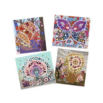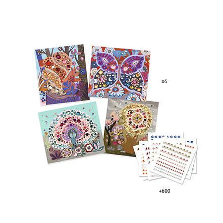 Aconselhado para crianças com mais de 6 anos. Conteúdo: 4 cartões ilustrados para completar (14 × 16 cm), mais de 600 pedrinhas autocolantes e 1 conjunto de instruções. Fabricado em papel e cartão com certificação FSC®.