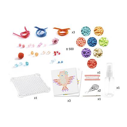 Aconselhado para crianças com mais de 6 anos. Conteúdo: 1 placa de suporte de trabalho, 1 pulverizador, um conjunto de contas de plástico que colam com água (8 cores), missangas e breloques, fio elástico transparente, fita de cetim, 1 agulha, 1 passador de fio, 1 folheto explicativo passo a passo em cores. Produto em papel e cartão com certificação FSC®.