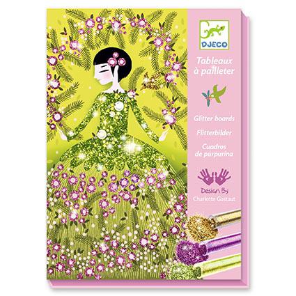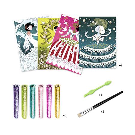 Aconselhado para crianças com mais de 6 anos. Conteúdo: 4 cartões impressos e pré-colados (15 x 21 cm), 6 tubos de purpurinas, 1 pincel, 1 ferramenta plástica para remoção das zonas adesivas e 1 livrinho explicativo passo a passo a cores. Inclui caixa de trabalho que ajuda a manter a atividade organizada e limpa durante a utilização. Produto em papel e cartão com certificação FSC®.