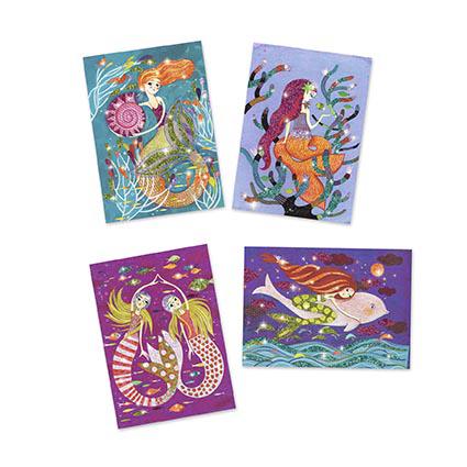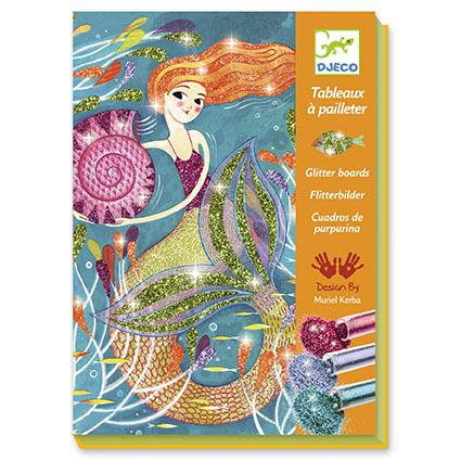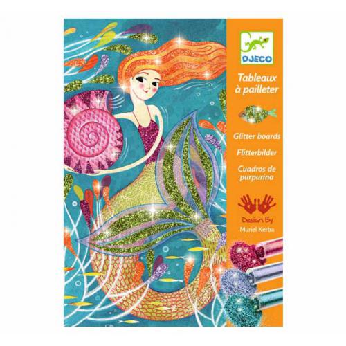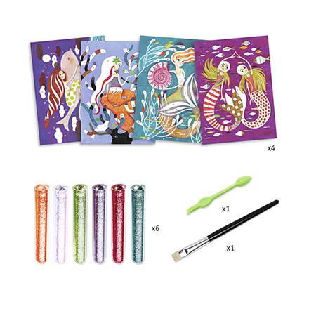 Desc. Técnica: Quatro quadros que representam encantadoras sereias para iluminares com purpurinas coloridas. Colocas o quadro dentro da caixa, revelas as zonas pré-coladas com a ferramenta fornecida e depois aplicas a purpurina seguindo o código de cores indicado no folheto. No final da atividade, estas maravilhosas sereias brilham e encantam-te! Atividade limpa, pois trabalhas dentro da caixa para evitar espalhar as purpurinas.