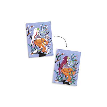 Aconselhado para crianças com mais de 6 anos. Conteúdo: 4 cartões impressos e pré-colados (15 x 21 cm), 6 tubos de purpurinas, 1 pincel, 1 ferramenta plástica para remoção das zonas adesivas e 1 livrinho explicativo passo a passo a cores. Inclui caixa de trabalho que ajuda a manter a atividade organizada e limpa durante a utilização. Produto em papel e cartão com certificação FSC®.