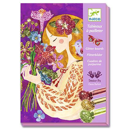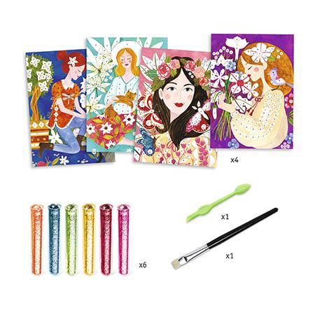 Desc. Técnica: Quatro quadros que representam jovens encantadoras apaixonadas por flores para iluminares com purpurinas coloridas. Colocas o teu quadro dentro da caixa, revelas as zonas pré-coladas com a ferramenta fornecida e depois polvilhas com a purpurina seguindo o código de cores indicado no folheto. No final, as cenas bucólicas ganham brilho e vida para o teu maior prazer!