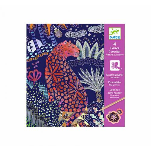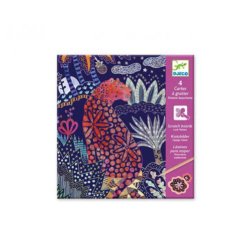 Desc. Técnica: Uma caixa com 4 cartões para raspar que apresentam animais selvagens num ambiente natural exuberante. A criança reproduz os padrões imaginados pelo artista ao raspar a superfície com o estilete de madeira. Aos poucos, as ilustrações vão sendo reveladas como por magia! Que prazer descobrir as ilustrações escondidas! Permite aprender a criar padrões.