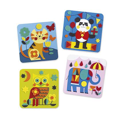Aconselhado para crianças com mais de 3 anos. Conteúdo: 4 quadros ilustrados, 111 autocolantes em feltro e 1 folheto explicativo passo a passo. Produto em papel e cartão com certificação FSC®.