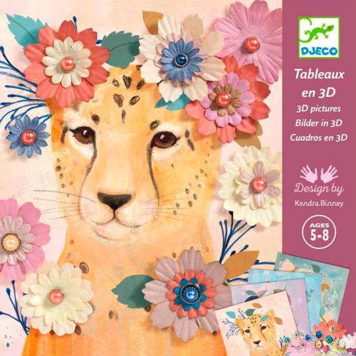 Desc. Técnica: Para completar os 4 quadros, há uma variedade enorme de pétalas de papel. A criança escolhe a combinação que mais gosta e fixa-as com lindos fechos. As cabeças dos animais ficam cobertas com lindas coroas de flores. Decorações com volume para criar e completar as pinturas. Mais de 100 corolas de papel com relevo, pré-cortadas, em diversos formatos. Uma montagem simples graças às bonitas tachas com pedras.