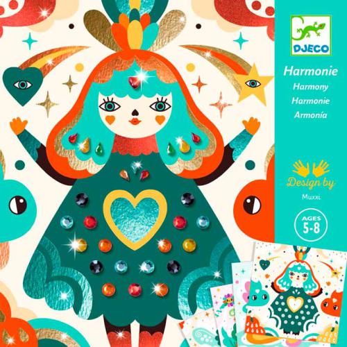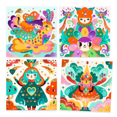 Aconselhado para crianças com mais de 5 anos. Conteúdo: 4 cartões ilustrados (20 x 20 cm), 1 sortido de folhas coloridas texturizadas para colar, 33 brilhantes autocolantes e 1 folheto colorido com instruções passo a passo. Produto em papel e cartão com certificação FSC®.