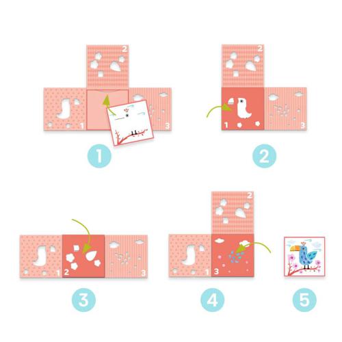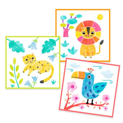 Aconselhado para crianças com mais de 3 anos. Conteúdo: 4 stencils com 3 abas dobráveis e 12 folhas impressas para colocar no stencil. Produto em papel e cartão com certificação FSC®.