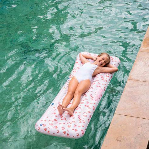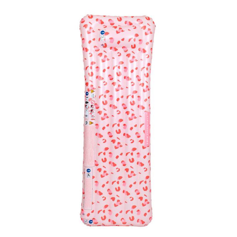 Design: padrão Old Pink Leopard com formato mais alto e largo e apoio de cabeça integrado. Desempenho: sensação de lounge ultra confortável com suporte estável e flutuação fácil. Tamanho: 177 × 67 × 19 cm; suporta até 80 kg (recomendado a partir dos 6 anos). Segurança: PVC resistente com duas câmaras de ar; inclui kit de reparação.