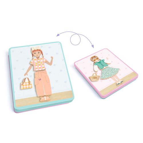 Desc. Técnica: As crianças brincam com Ímans de madeira numa caixa metálica fina. Recriam os 12 fatos apresentados nos cartões, escolhendo o lado direito da caixa. Trata-se de um jogo divertido que consiste em recriar imagens a partir de modelos, utilizando ímans temáticos de vestuário e acessórios! Cada lado da caixa apresenta uma ilustração diferente, oferecendo dois ambientes de jogo distintos. Os ímans são de madeira de alta qualidade. As peças podem ser facilmente guardadas na caixa metálica no final do jogo. Perfeito para levar para todo o lado!