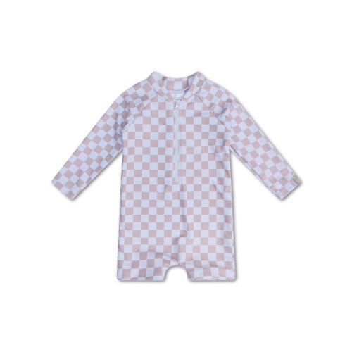 86/92. Material: 80% poliéster e 20% elastano, suave e elástico. Proteção UPF50+ contra raios solares. Disponível nos tamanhos 62/68 a 98/104. Design xadrez bege e branco com manga comprida.