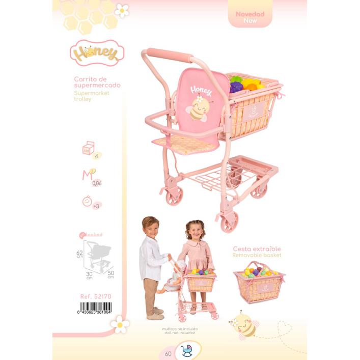 Desc. Técnica: Surpreenda as crianças com o seu próprio carrinho de compras, para que possam desfrutar da brincadeira de faz-de-conta mais fantástica e realista. Leva para casa este bonito Carrinho de Supermercado Honey com acessórios e porta-bebés que favorecem a brincadeira mais realista e completa possível. Ir às compras com a família é agora muito mais divertido e educativo, graças a este conjunto completo que inclui o carrinho de compras mais prático com comida de brincar e muitas outras surpresas com o design mais moderno, com espaço para o bebé de brinquedo e um cesto desmontável!