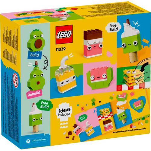 O LEGO® Classic - Amigos Alimentos Criativos é um set versátil para crianças com mais de 4 anos que incentiva o faz-de-conta com personagens de alimentos divertidas. Com peças coloridas e elementos especiais como olhos e bocas, permite construir 4 modelos (cupcake, gelado, abacate e taco) e depois reconstruí-los em novas combinações como bolo, bubble-tea, pêra e panini. As crianças podem ainda seguir o guia para alterar expressões, formas e cores e criar novos amigos alimentos. Desenvolve a confiança, a concentração e a resolução de problemas enquanto exploram a construção livre.