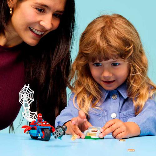 Coloca a ação de super-heróis nas mãos das crianças com o set Spidey na sua mota vs Rhino, ideal para crianças a partir dos 4 anos. Inclui minifiguras do Spidey e do Rhino, além de uma mota com forma de aranha e funcionalidades que estimulam o jogo criativo. As crianças ajudam o Spidey a recuperar a joia azul, a desviar-se das pizzas lançadas pelo Rhino e a capturar o vilão com uma teia gigante. O set foi criado para pequenos construtores, com peças iniciais, sacos separados e instruções ilustradas que facilitam a montagem.