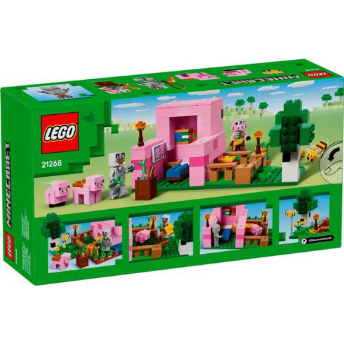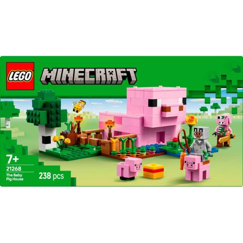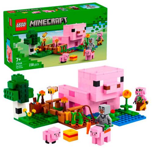 A Casa do Porco Bebé é um set LEGO Minecraft para crianças com mais de 7 anos que recria uma casa em forma de porco no bioma da floresta. Inclui várias figuras como um herói com skin de lobo, porquinho bebé, porco adulto, abelha e piglin zombie. As crianças podem cuidar dos animais, cultivar plantas e evitar inimigos enquanto exploram a casa com cama, estante e mesa de trabalho. É um set interativo e criativo, ideal para fãs de Minecraft e construção de cenários.