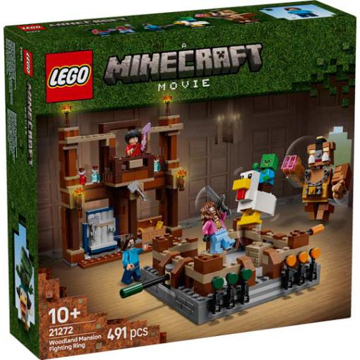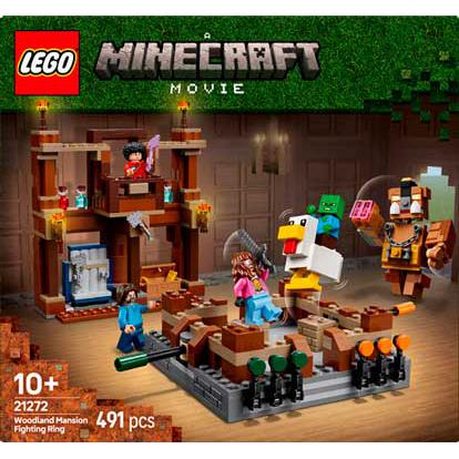 O Ringue de Luta da Mansão da Floresta é um set LEGO Minecraft para crianças com mais de 10 anos inspirado no filme, que inclui personagens como Steve, Garrett, um zombie bebé, um jóquei da galinha e um grande porco ajustável. Apresenta um ringue de luta funcional com manivelas para posicionar os combatentes, além de armas, poções e uma fachada de mansão com baú removível e suporte para armas. É um set interativo e dinâmico, ideal para recriar batalhas e criar novas aventuras no universo Minecraft.