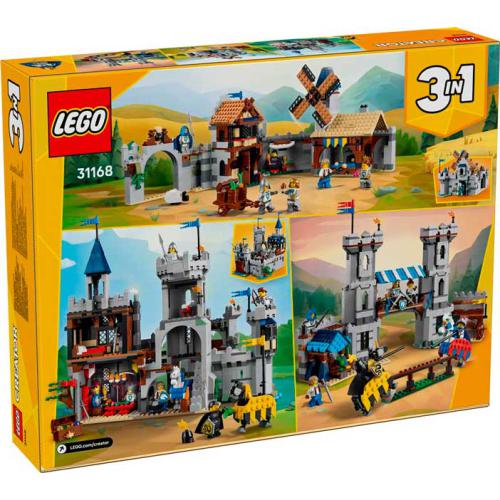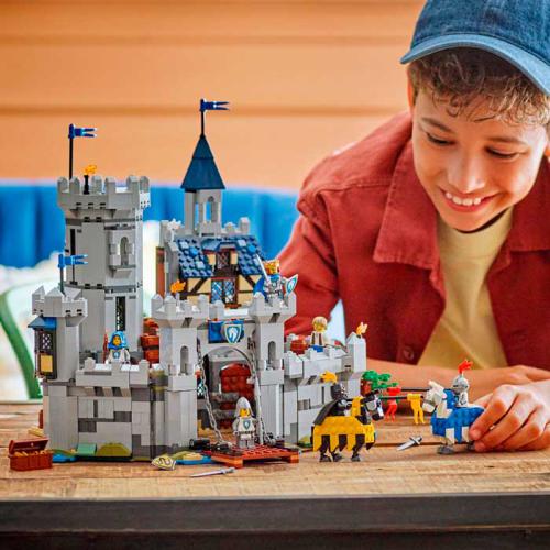 Apresenta a ação medieval às crianças com o LEGO Creator 3 em 1 Castelo Medieval com Cavaleiro e Cavalo, onde exploras um castelo detalhado com ponte levadiça, grande salão, estábulo, ferraria, baú secreto, quarto do rei, sala de escrita e torres com terraços, abrindo-se atrás para mais aventuras. Podes construir e reconstruir 3 modelos diferentes: castelo interativo, cenário de justa ou cidade medieval com moinho, e dar vida a histórias com 6 minifiguras e 2 cavalos ajustáveis.