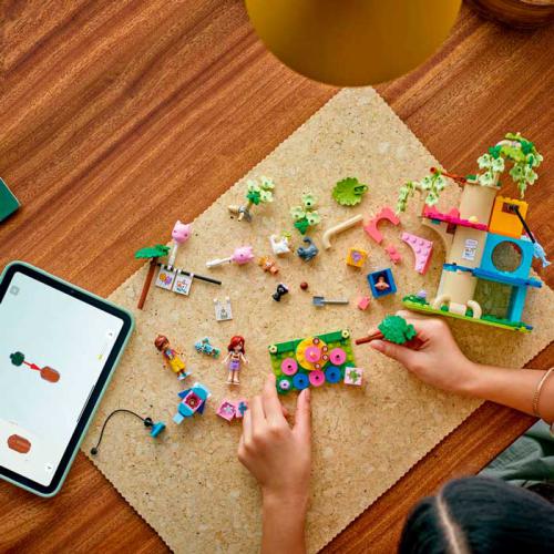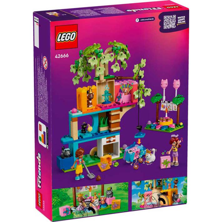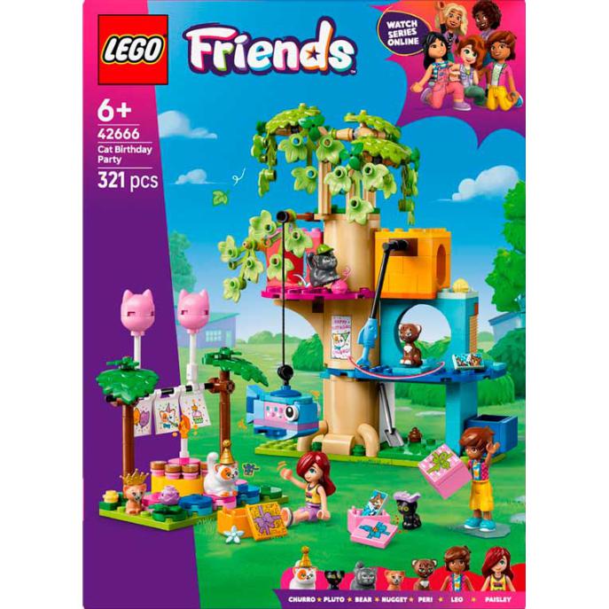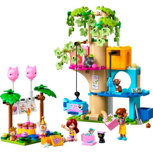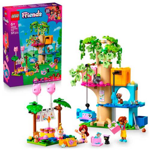 O LEGO® Friends Festa de Aniversário do Gato e Casa na Árvore permite às crianças criar histórias com o Leo, a Paisley e vários gatos numa festa de aniversário. Inclui 2 minibonecos, 5 figuras de gatos e acessórios como presentes, balões, pinhata e bolo. As crianças podem explorar a casa da árvore com fonte, caixa de areia e mesa rotativa para os gatos. Estimula a criatividade, o cuidado com animais e o jogo de faz de conta em cenários de amizade.