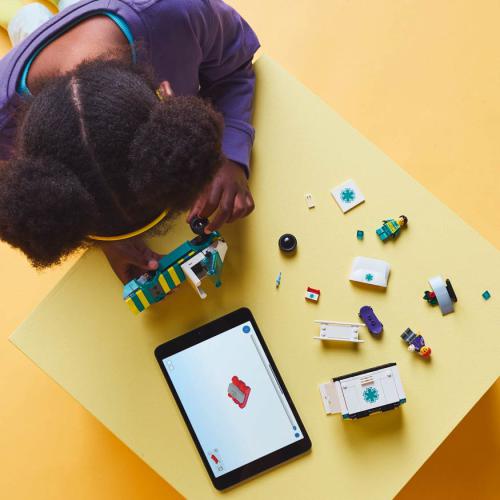 O set LEGO® City Ambulância de Emergência inclui uma carrinha com painéis laterais e portas traseiras que abrem, maca e equipamento médico. Traz minifiguras de médica e skater, além de uma rampa e skate, permitindo recriar cenários de resgate e ação em histórias urbanas.