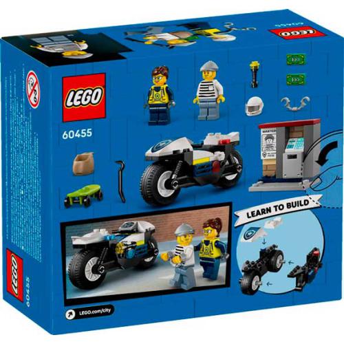 O set LEGO® City Perseguição com Mota da Polícia inclui uma mota com pneus largos, um skate para fuga e um minimultibanco com nota de brincar. Traz minifiguras de polícia e ladrão, permitindo criar cenários simples de perseguição e brincadeiras de ação.