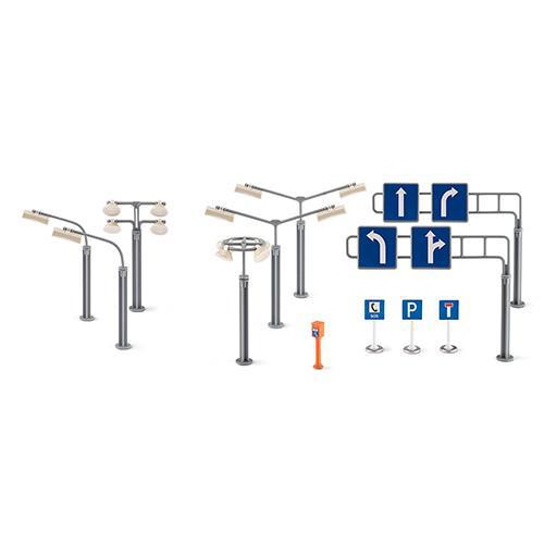 Conjunto suplementar para SIKUWORLD com luzes de rua, de parque de estacionamento e de estaleiro, bem como vários sinais de trânsito. Com folha de autocolantes.
