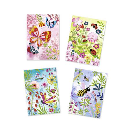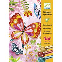 Aconselhado para crianças com mais de 6 anos. Conteúdo: 4 cartões impressos e pré-colados (15 x 21 cm), 6 tubos de purpurinas, 1 pincel, 1 ferramenta plástica para remoção das zonas adesivas e 1 livrinho explicativo passo a passo a cores. Inclui caixa de trabalho que ajuda a manter a atividade organizada e limpa durante a utilização. Produto em papel e cartão com certificação FSC®.