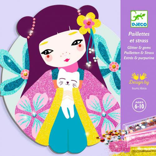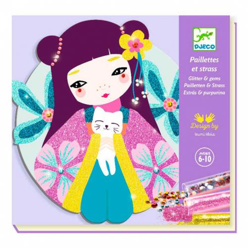 Aconselhado para crianças com mais de 6 anos. Conteúdo: 4 cartões impressos e pré-colados de forma arredondada (diâmetro 21 cm), 4 tubos de purpurinas, 1 conjunto de mini strass, 1 ferramenta plástica para remoção das zonas adesivas, 1 pincel para remover o excesso, 4 suportes adesivos para suspensão e 1 livrinho explicativo passo a passo a cores. Inclui caixa de trabalho que ajuda a manter a atividade organizada e limpa durante a utilização.