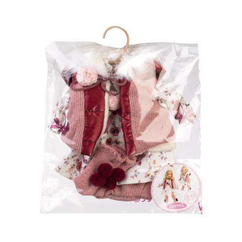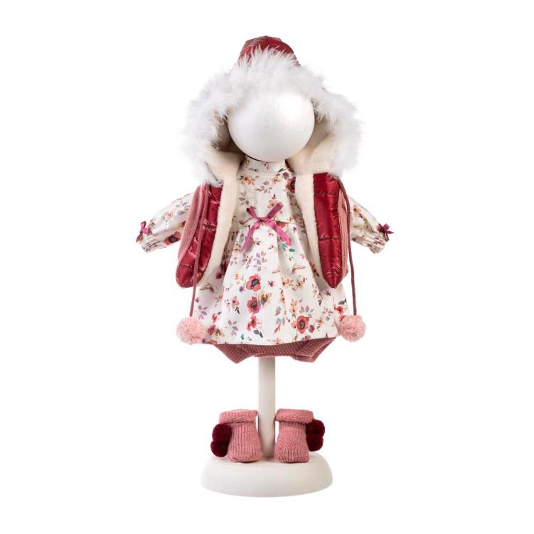 Vestido branco com flores e calções. Colete de pelo com capuz e pompons. Meia a combinar com os calções.