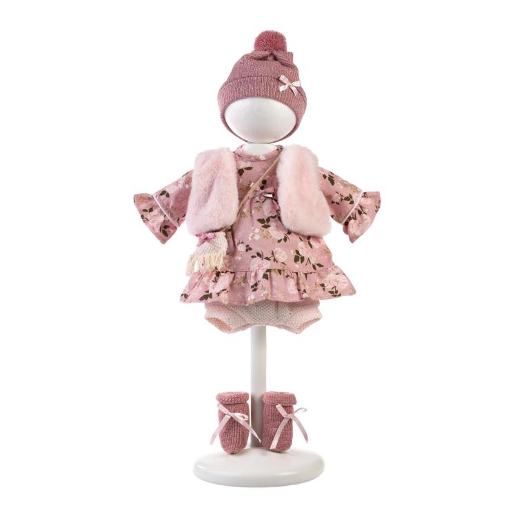 Vestido cor de rosa decorado com rosas com folhos. Colete de pelo, gorro com pompom e meias com laços a combinar, calções em malha e mala à tiracolo.
