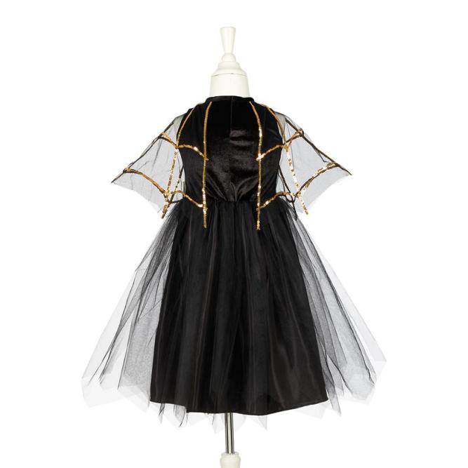 Este vestido original em cor preta fará com que pareças uma aterrorizante tarântula, com a sua capa de teia de aranha com bonitos detalhes em estrelas douradas.