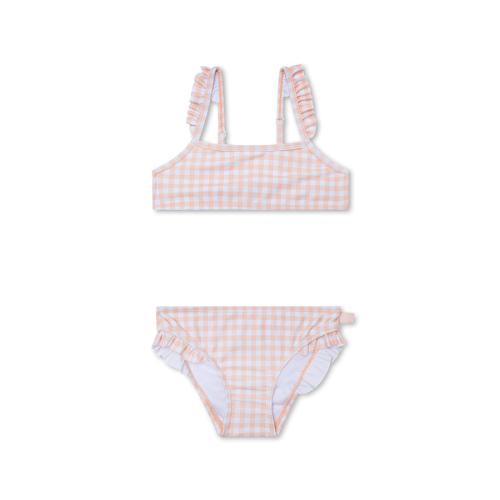 134/140. Material: 80% poliéster reciclado e 20% elastano com elasticidade suave. Tecido com proteção UPF50+. Disponível nos tamanhos 86/92 a 146/152. Design em grelha laranja e branca.