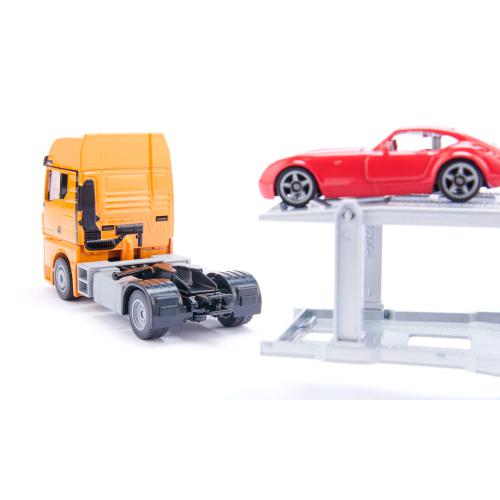 O camião pesado chega finalmente ao pátio do concessionário, depois de muito esperado. Na plataforma de transporte de dois níveis estão novos automóveis de passageiros, prontos a serem vistos pelos novos proprietários. O trator pesado com pintura amarela e lettering da MAN Truck & Bus destaca-se pela cabine moderna com visão do interior. O acoplamento do reboque é simples e a descarga deve ser feita com cuidado para evitar riscos na pintura. O conjunto da siku é feito em metal fundido com peças em plástico e o semi-reboque pode transportar carros, máquinas agrícolas ou de construção.