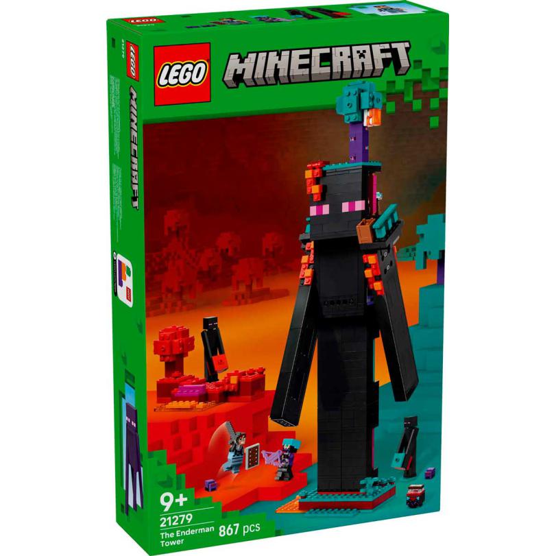 Desc. Técnica: A Torre do Enderman é um set LEGO Minecraft para crianças com mais de 9 anos com design modular que permite brincar e expor de diferentes formas. O modelo principal representa um Enderman com portal do Nether na cabeça, divisões interiores com mesa de trabalho e encantamentos, e elementos de biomas exteriores. Inclui minifiguras como Defensor Dimensional, Invasor de Realms, Endermans e Endermites, além de armas e acessórios. Com 867 peças, pode ainda ser reconstruído em duas fortalezas para batalhas PvP.