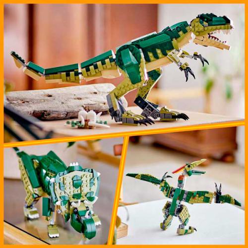 Desc. Técnica: Crianças com mais de 9 anos podem recuar no tempo com o LEGO Creator 3 em 1 T-Rex, um dinossauro ajustável com cabeça, patas, mandíbula e membros móveis. Este set inclui também um ninho com ovos e permite construir 3 modelos diferentes: T-Rex, triceratops ou pterodáctilo com asas móveis. É um conjunto versátil que estimula a criatividade e pode ser exposto como peça decorativa.