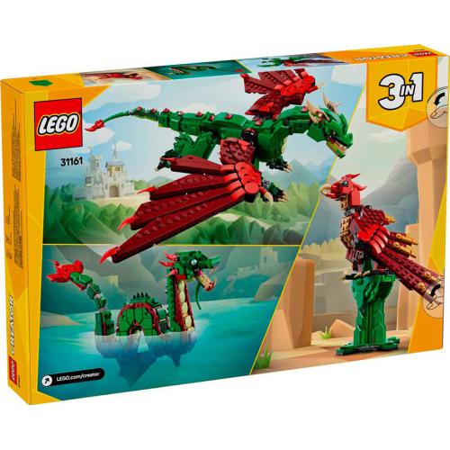 Desc. Técnica: Com este set, vais dar asas à imaginação com um dragão medieval articulado, com asas grandes ajustáveis, mandíbula, pescoço, cauda e várias articulações para ação dinâmica, além de um baú do tesouro para enriquecer a brincadeira. Podes reconstruí-lo em mais dois animais míticos: uma serpente marinha ou uma fénix, usando as mesmas peças. Cada modelo oferece possibilidades criativas diferentes e pode ser usado para brincar ou expor.