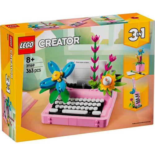 Desc. Técnica: Surpreende os pequenos fãs de flores, artes e design com o LEGO Creator 3 em 1 Máquina de Escrever com Flores, uma mini máquina de escrever decorada com flores coloridas, teclado móvel, rolo funcional e folha construída com peças para brincadeiras criativas. Podes construir e reconstruir 3 modelos: máquina de escrever, sintetizador com flores ou vaso com caneta e bloco, usando as mesmas peças e explorar diferentes formas de expressão. Inclui ainda autocolantes com frases inspiradoras para personalizares os modelos.